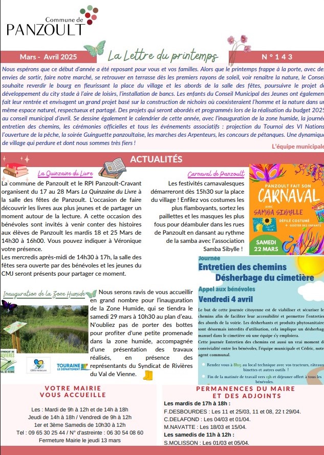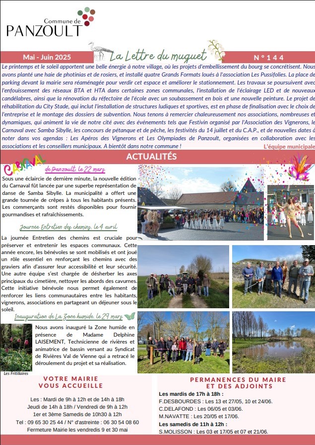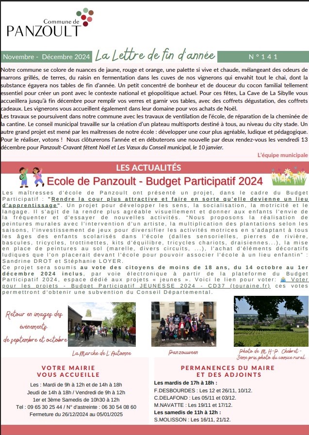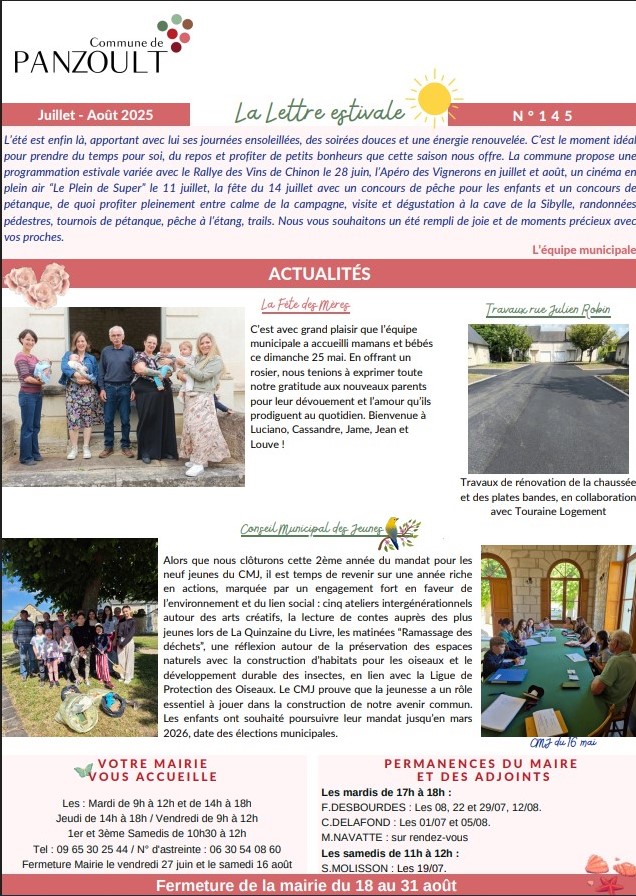 Retour Notre village Lettre estivale 2025 Lettre du muguet 2025 Lettre de printemps 2025 Lettre de début d'année 2025 Lettre de fin d'année 2024 Lettre de rentrée 2024 Lettre estival 2024 Lettre du muguet 2024 Lettre du printemps 2024 Lettre Hivernale 2024 Lettre automnale 2023 Lettre de rentrée 2023 Lettre estival 2023 Lettre du muguet 2023 Lettre du printemps 2023 Lettre de hivernal 2023 Lettre de automnale 2022 Lettre de rentrée 2022 Lettre estivale 2022